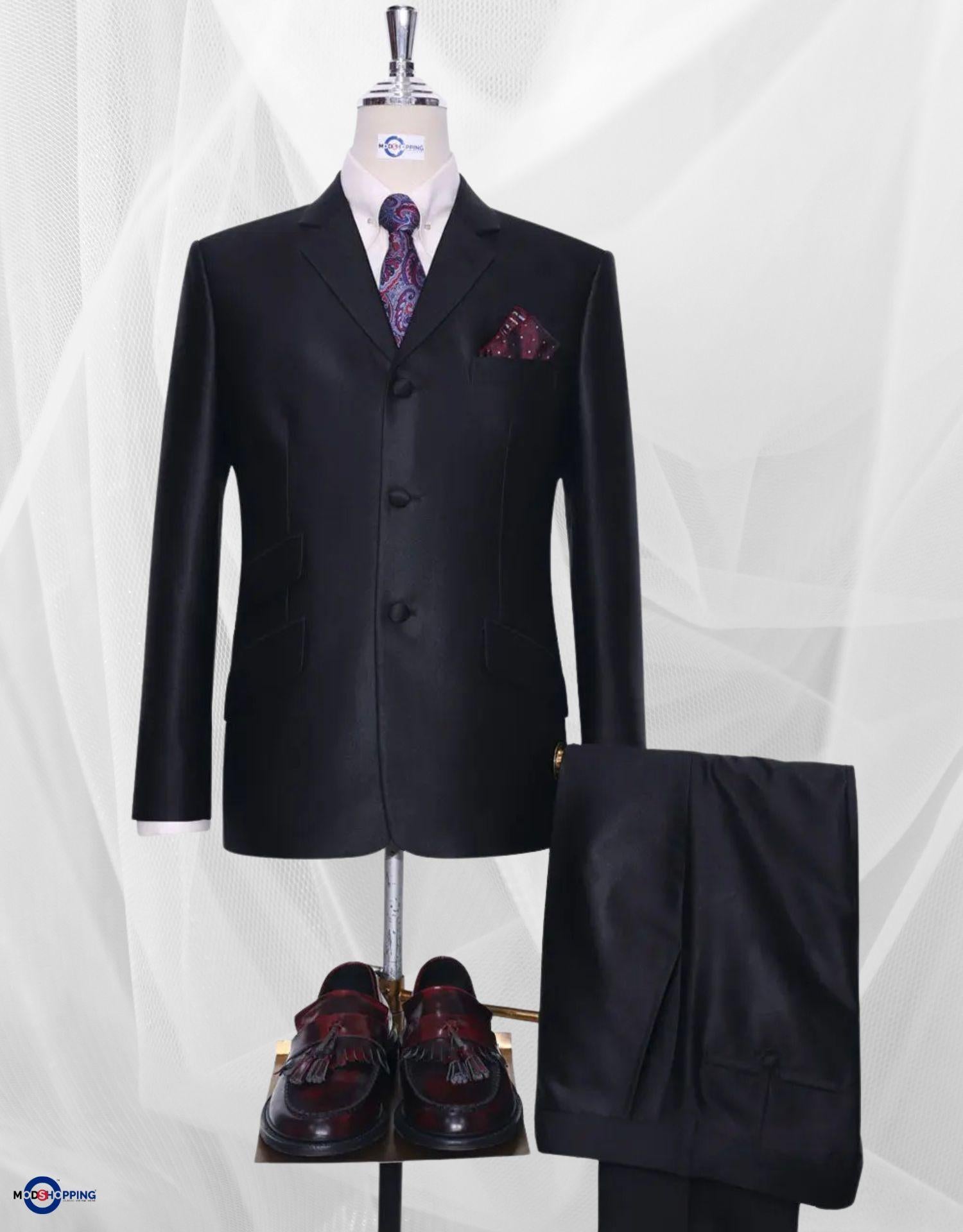 DESCRIPTION: A fabulous, 100% authentic designer by Modshopping60s Vintage style super 60's Retro mod super fine Classic black color 2 piece tonic suit, Fabric composition: 60% wool & 40% Polyester mixColor: essential blackLining: Burgundy paisleyNumber of piece: 2 piece suit Jacket:Single breasted with front Three (3) Covered button Jacket.Narrow 2.5 inches wide notch lapel in front, and one button hole on left lapel of Jacket1 breasted top pocket 1-1 front hips flap pocket & right side one traditional ticket pocket with flaphigh button classic style jacket.4 buttons non working cuff sleevesIt is fully lined in a luxury plain red color lining,covered button. Very cool looking,with 4 internal working pocket of jacket.double vent at the back. Trouser: In front of trouser both side angle pockets, Back side of the trouser one right side slit pocket
