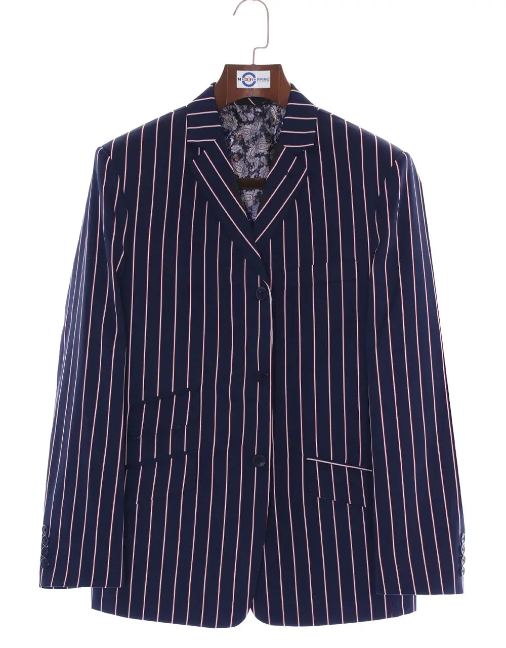 Fabric is little light weight 60% Wool 40% Polyester mix. Color: navy blue, red and white Jacket:3 button jacket, navy blue matching plain buttons2 1/2" wide notch lapel, High button jacket4 buttons non-working cuff, single vent at the back1 Breasted pocket,1-1 Flap pocket jacket, and traditional ticket pocket with flapMatching full inside lining of jacket Dry clean onlyTailor made jacketN.B These jacket are tailored fitN.B = only jacket not including shirt, shoe, necktie and pinNote: Dear valuable customers this jacket is made to order. For emergency dispatch please contact us via email. Thank you for your patienceSecure Checkout With