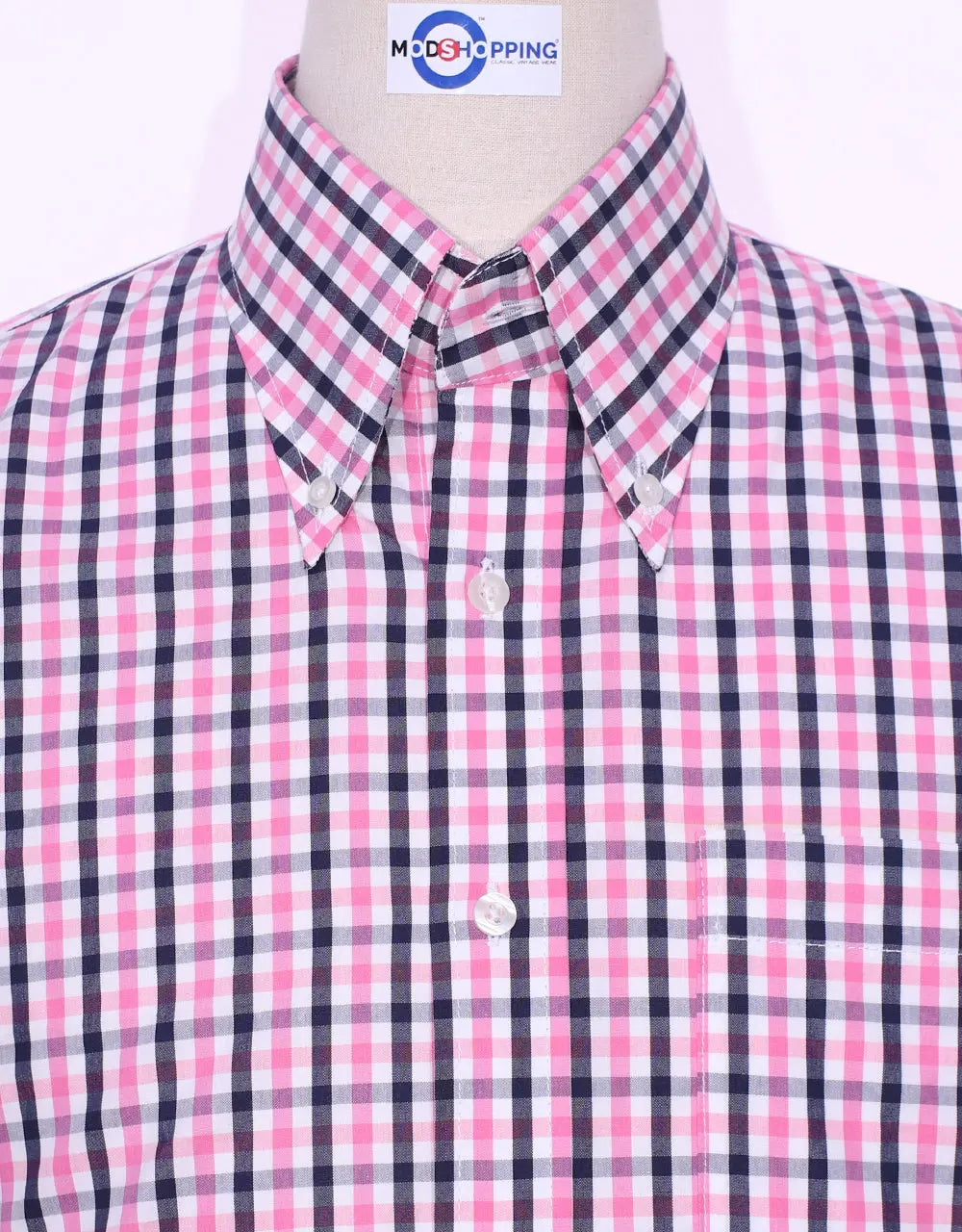 Modshopping classic Men’s tailored made men shirt for any occasion Color: Pink and BlackPattern: Windowpane CheckCollar: Button down long collar Collar length: 4 inches Cuff: Two Button Mitered CuffA unique tailored feel Box Pleat At The Back, Darts at the backlocker loop, and the back collar button left side Chest Pocket1960s vintage style shirt Brilliant tailored fit Men’s shirt.Fabric 100% cottonhand wash & machine wash onlySecure Checkout With