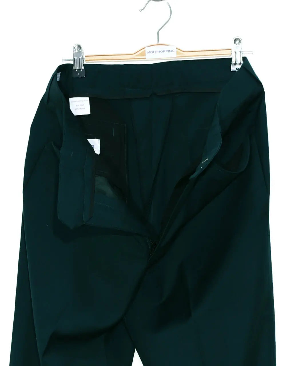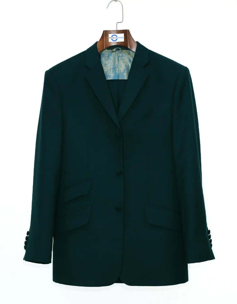 A fabulous, 100% authentic designer executiveformal business classic super luxury tailor madestyle by "Modshopping" Fabric composition: 60% wool & 40% Polyester mix Pattern: Phthalo Green Number of piece: 2 piece suit Jacket: Single breasted with front Three (3) Covered button Jacket.Narrow 2.5 inches narrow notch lapel in front,and one button hole in left lapel of Jacket1 breasted top pocket 1-1 front hips flap pocket & right side one traditional ticket pocket with flaphigh button classic style jacket.4 buttons working cuff of Jacket sleeve It is fully lined in a luxury paisley lining,covered button. Very cool looking,with 4 internal working pocket.double vent at the back. Trouser:In front of trouser both side Frogmouth pockets,Right side of the trouser 1 slit back pocketCovered buttons , Rubber grip at waistFly zip, 1/2 lining trouserBottom of trouser 16" cuff Dry clean onlyTailor madeN.B These Suits are tailored to fitN.B = only suit not including shirt, shoe, necktie and pinNote: Dear valuable customers this suit is made to order. For emergency dispatch please contact us via email. Thank you for your patience