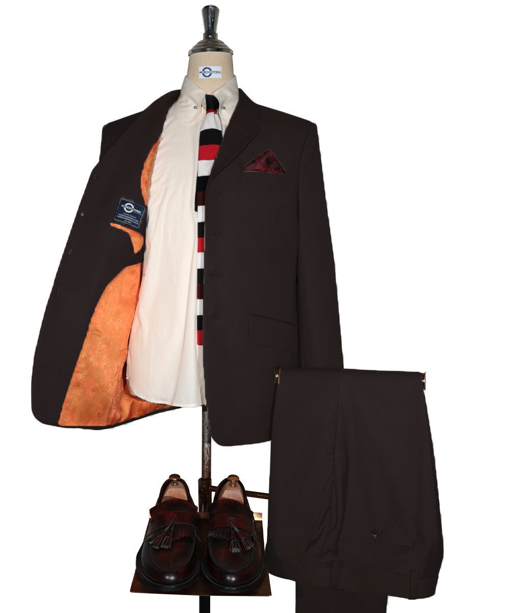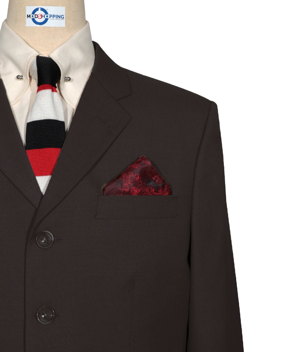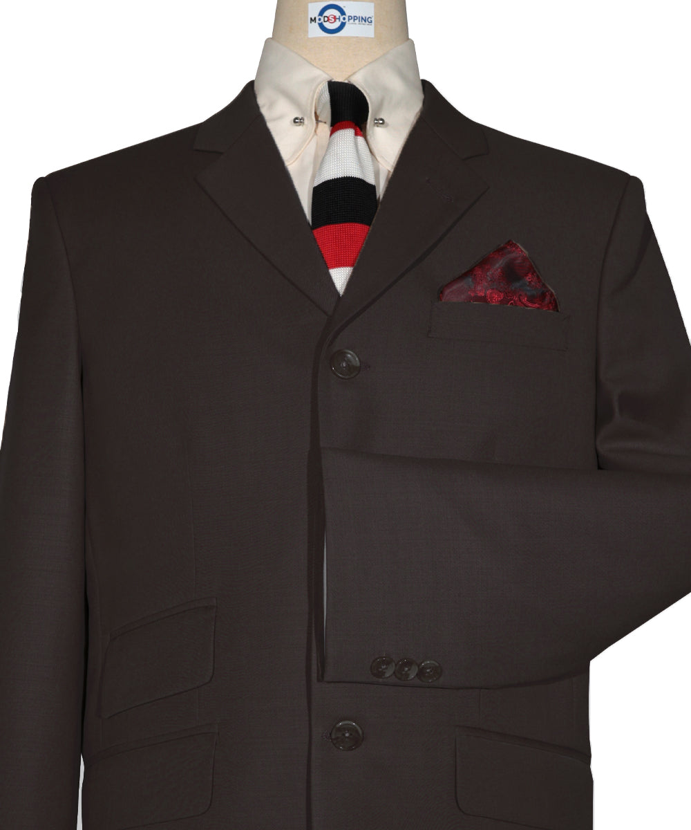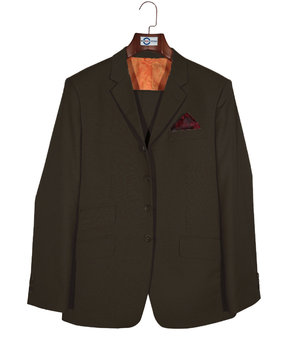 Brand: ModshoppingStyle: Single breasted suitColor: Chocolate BrownMaterial: 80% Wool and 20% Mohair Mix: PlainJacket:Modshopping A 2 piece suit for the gents,Classic chocolate brown suit4 buttons jacket,1/1 jacket's front hips pocket and right side one traditional ticket pocket with flapSingle breasted pocket.Covered button suit,2.5 inches Notch lapelButtonhole on the left lapel.Side vent, 3 Buttons non-working cuff of JacketMatching full inside lining of jacket. Trouser: Trouser front both side slant pocket