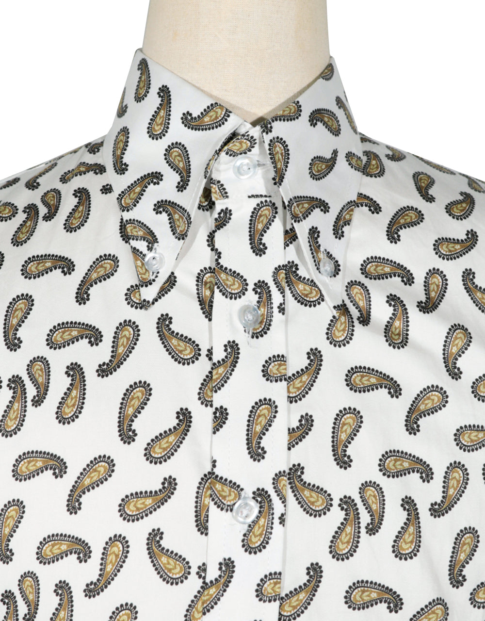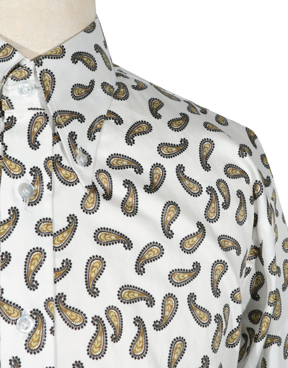 Modshopping 100% Cotton60s style paisley shirt for men Collar: 4 inches narrow button down collar. Color : White, Brown and Black Pattern : PaisleyFabric:100% cottonGender: MenCuff: Two Button Mitered Cuffdarts at the backBrilliant tailored fitted Men’s shirt.hand wash & machine wash onlySecure Checkout With