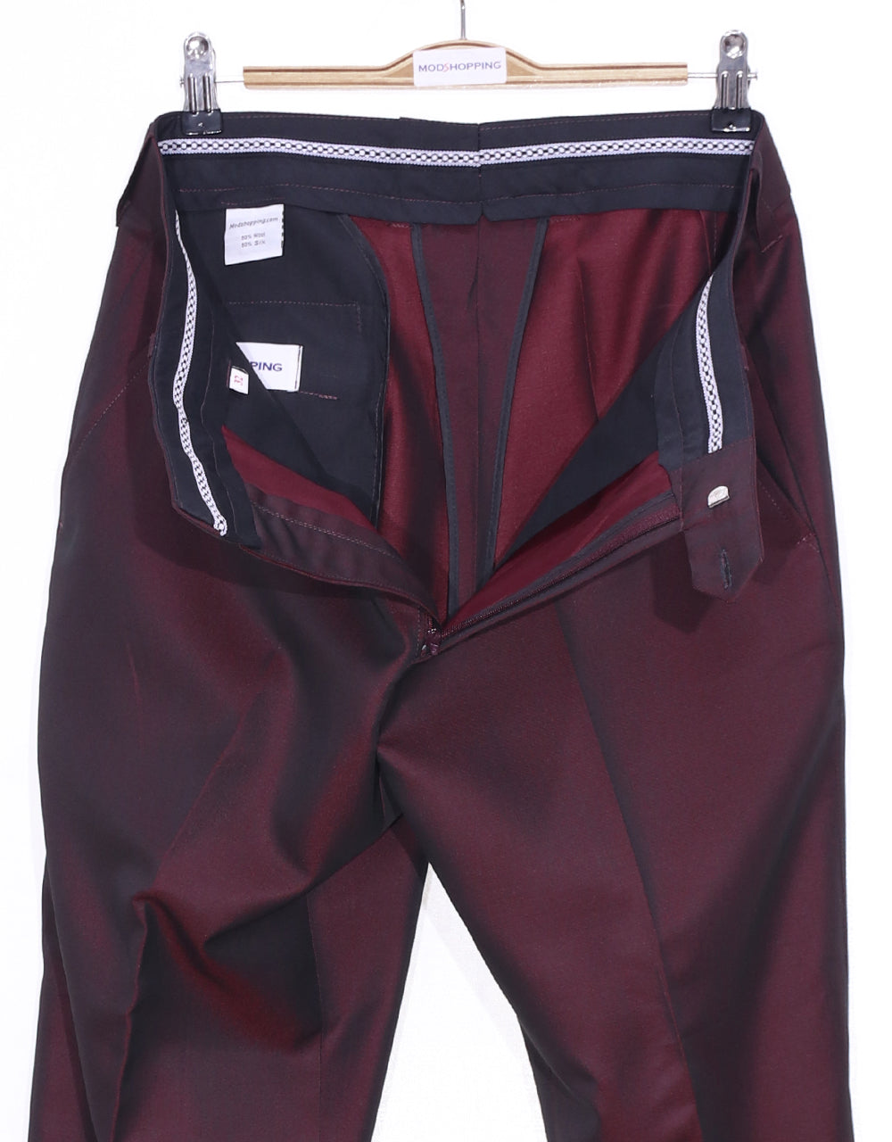 Fabric Composition: 50% Wool 50% Mohair mixLining: 50% Polyester & 50% Viscose.Color: Red And Black Two Tone Fabric pattern: two tone Jacket: Men’s Sixties style Mod tailored 3 button 2 piece red and black two tone suits.Retro Mod jacket that features the Classic,Mod 3 Covered button fasten,