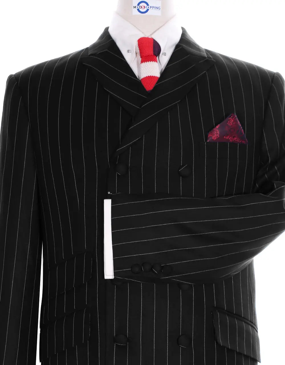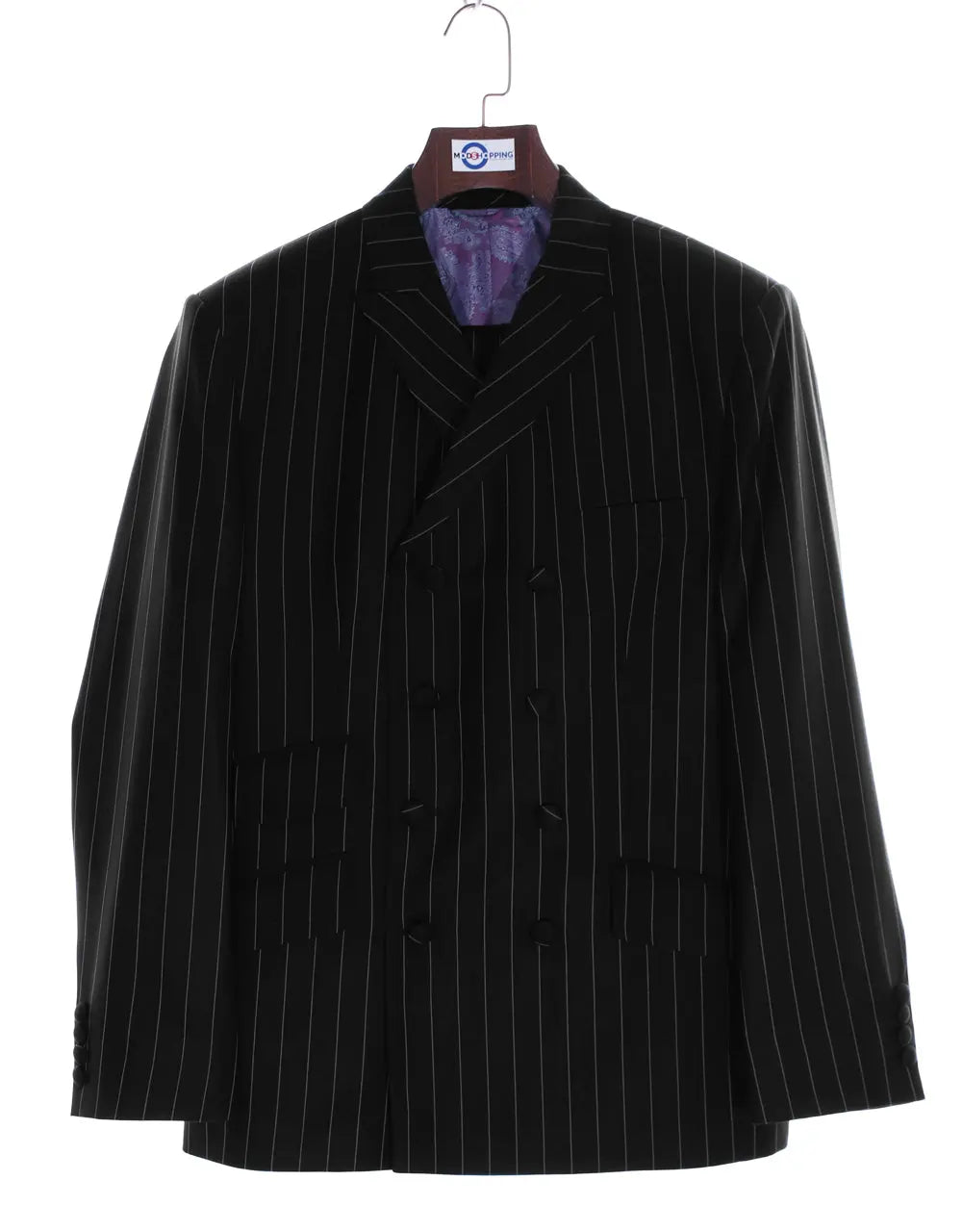A fabulous, 100% authentic designer executiveformal business classic super luxury tailor made suitsuper fine striped 2 piece double breasted suit ,style by "Modshopping" Fabric composition:50% wool & 50% Mohair mixPattern: StripeNumber of piece: 2 piece suit Jacket:Modshopping A 2 piece double breasted suit for the gents ,Peak lapel, Left lapel one buttonhole Narrow 2.25 inches peak lapel4/8 buttons jacket,1/1 jacket's front flap pocket1 traditional ticket flap pocket Top left side Single breasted pocket Side vent4 Button non working cuff of jacket Covered button of suittonic lining in side of jacket, Trouser:Front both side Frogmouth pocket1 back slit pocket